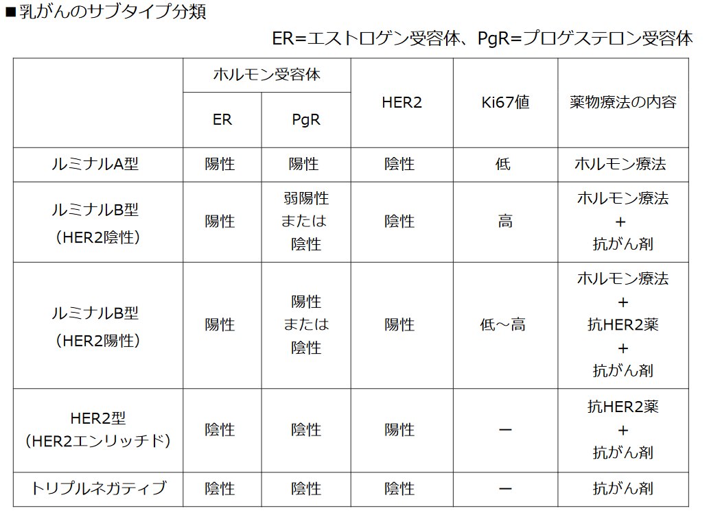 同じ乳がんでも、比較的おとなしいものから悪性度が高いものまで、その性質はさまざまです。ホルモン受容体(ホルモン感受性)の有無、HER2タンパクの過剰発現の有無、がん細胞の増殖能力を示す指標Ki67によって5つのサブタイプに分けられ、推奨される薬物療法の内容が異なります(下表)。